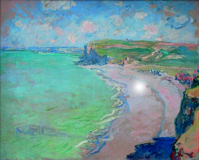 W polskich zbiorach muzealnych znajduje się jeden obraz Moneta, „Plaża w Pourville”. Praca została namalowana w 1882 r. w małym nadmorskim kurorcie Pourville-sur-Mer (obecnie część gminy Hautot-sur-Mer). Artysta spędził zimę 1882 r. w Pourville. Cieszył się spędzonym tam czasem. Zauroczony miejscem postanowił wrócić z rodziną następnego lata. Pourville było wtedy niewielką wioską rybacką, która przyciągnęła malarza urokliwym krajobrazem. Wysokie klify porośnięte zielenią, szerokie kamieniste plaże i błękit morza zainspirowały artystę do stworzenia serii widoków francuskiego wybrzeża.